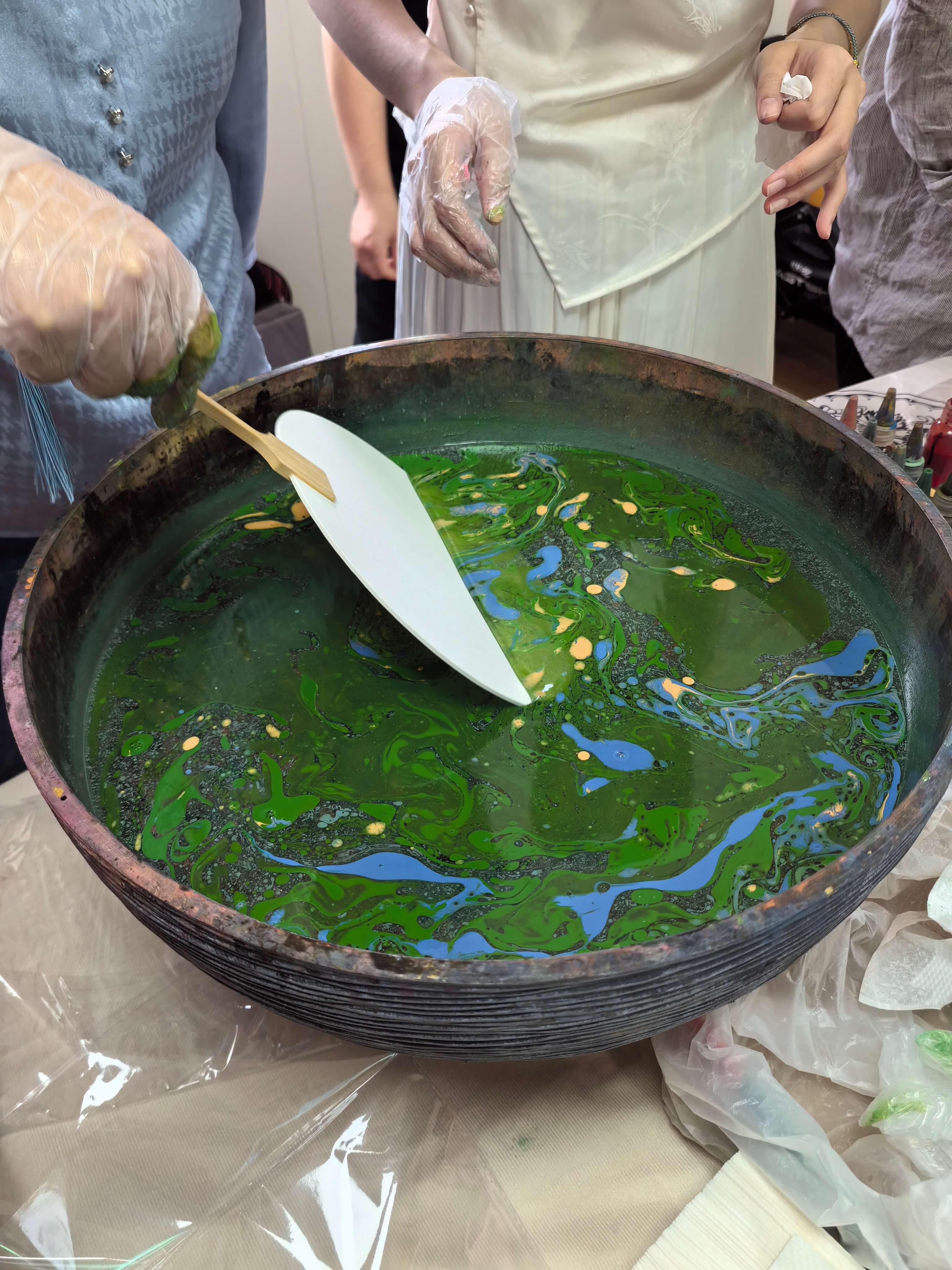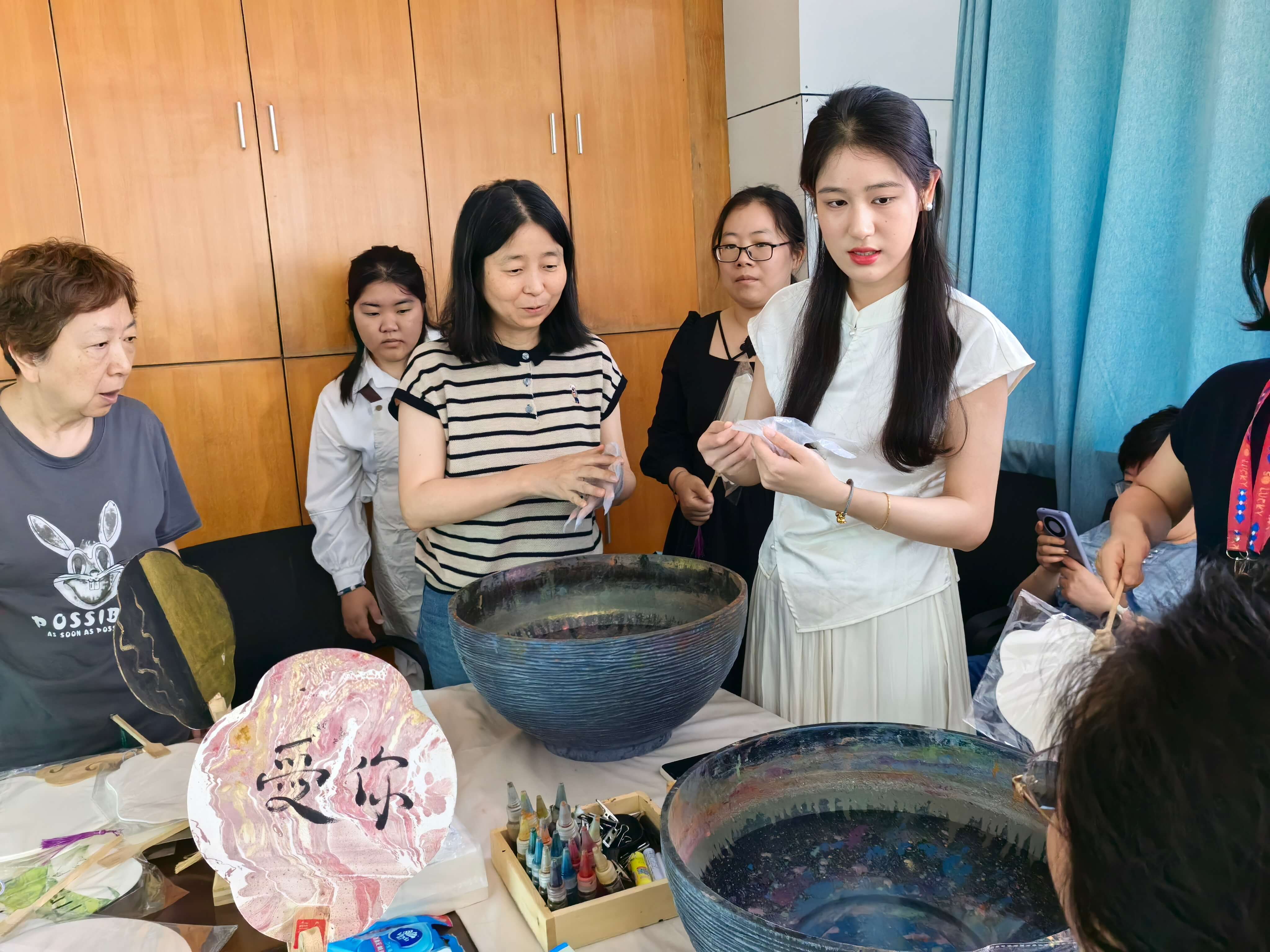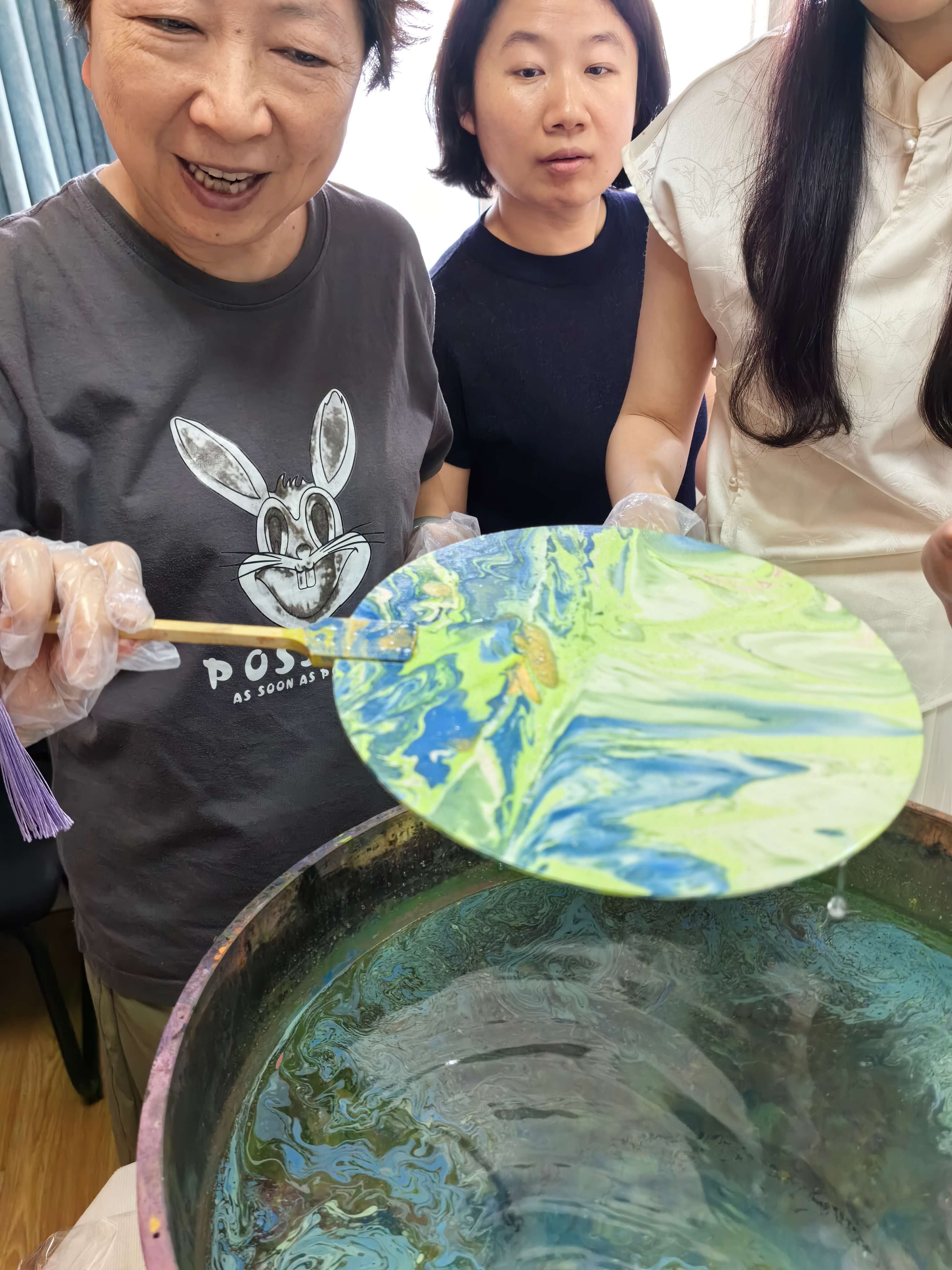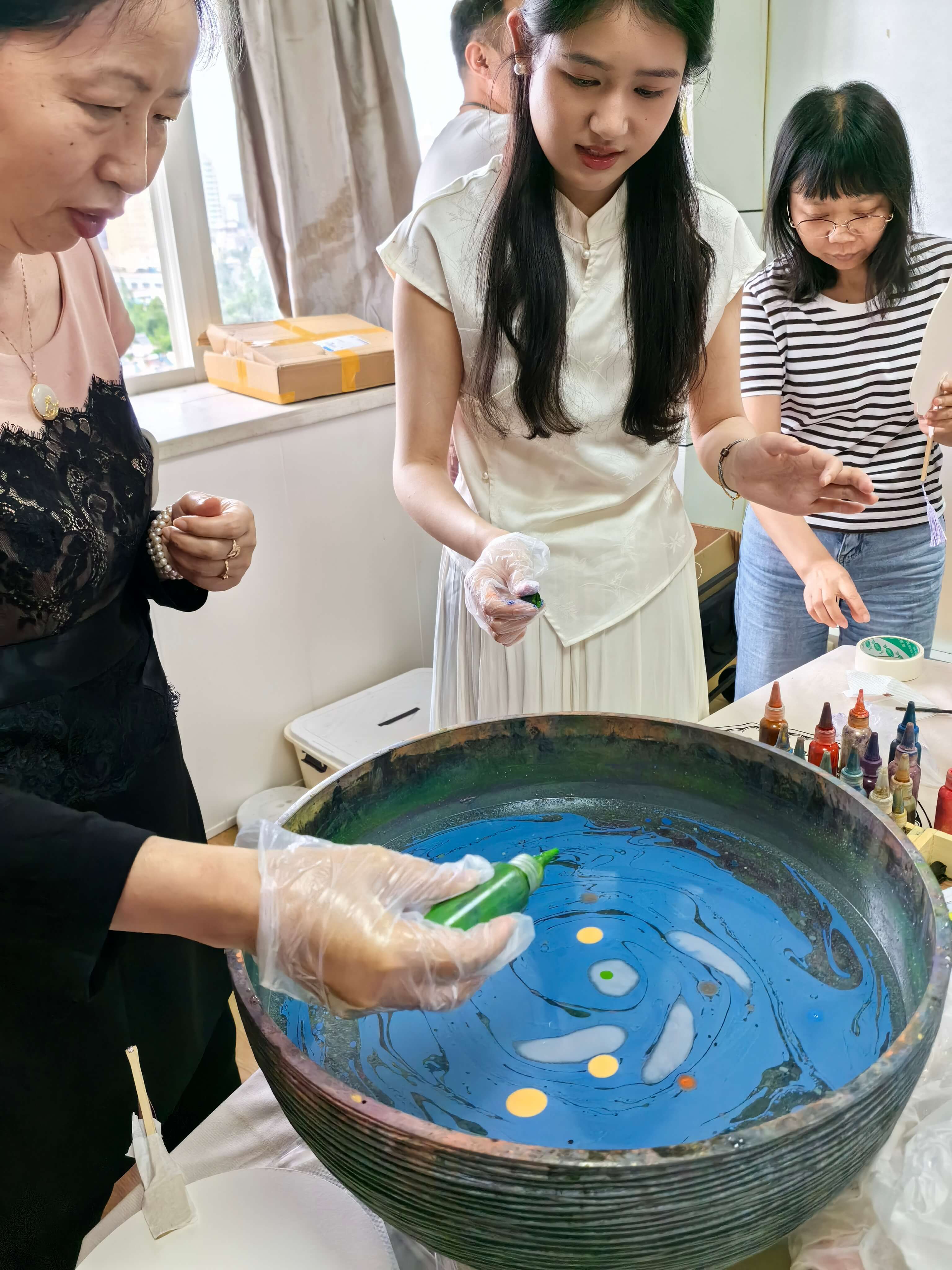 隨后的制作體驗環節將現場氣氛推向高潮,大家紛紛挑選自己喜歡的扇形,將“平安”“歡喜”等美好祝愿寫在扇面上,再置于水中漂染,一沉一提間,一件件獨一無二的藝術品誕生了。大家獨特想法和創意,以及對未來美好期許都體現在了小小的扇面上。